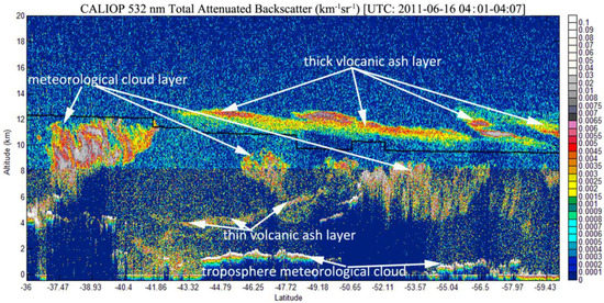 First, in the data preprocessing stage, although the cloud mask and the RGB false-color image are used together to further distinguish meteorological and volcanic ash clouds, uncertainties may still exist under certain situations. For example, when the volcanic ash cloud is very thin with a meteorological cloud underlying (Figure 11), the CALIOP L2 cloud top height data may reflect the height of the underlying meteorological cloud instead of the VTH. This may lead to underestimation of VTHs. In addition, the volcanic ash mask used in this study is derived from NOAA’s volcanic ash detection algorithm [29], and the algorithm may produce some false alarms or missing ash/dust clouds when it is applied in global scale [5]. Further investigation is needed on better distinguishing volcanic ash clouds and meteorological clouds.