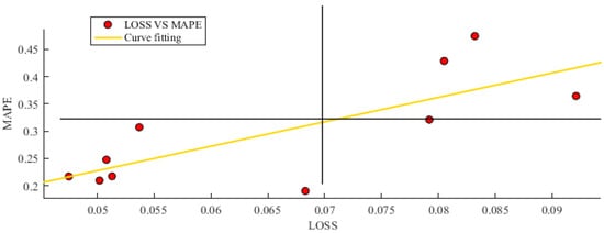 Table 4 and Figure 10 show the relationship between the different parameter sets used for the SDA reconstruction of the original features and the final MAPE of the derived VTHs. The LOSS varies with the learning rate. The highest loss function value is 0.0921 and the lowest is 0.0475, which indicates that the choice of hyperparameters directly influences the learning ability of the SDA. The MAPE also varies with LOSS. When the LOSS is 0.0832, the MAPE value peaks at 0.4741. When the LOSS is 0.0502, the MAPE reaches its lowest value of 0.2096. Figure 10 shows that there is a significant positive correlation between LOSS and MAPE (R = 0.62). These results suggest that the selection of features directly affects the accuracy of the final retrieval. In addition, the results obtained using the manual searching method, rather than using the grid searching method, for selecting the hyperparameters, are not stable. Therefore, implementing the grid searching method improves the accuracy and stability of the model.