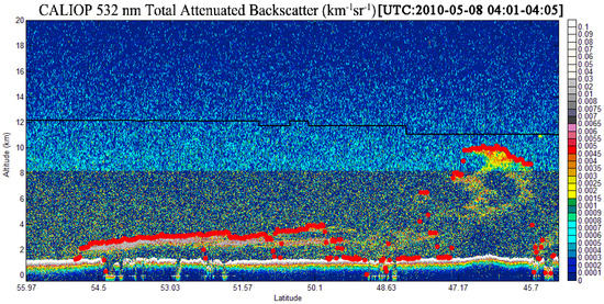 An example of CALIOP 532 nm total attenuated backscatter cross-section from 04:01:59 UTC–04:05:04 UTC on 8 May 2010 (Eyjafjallajökull eruption). The contemporary CALIOP L2 cloud heights products (red dots) are overlaid.