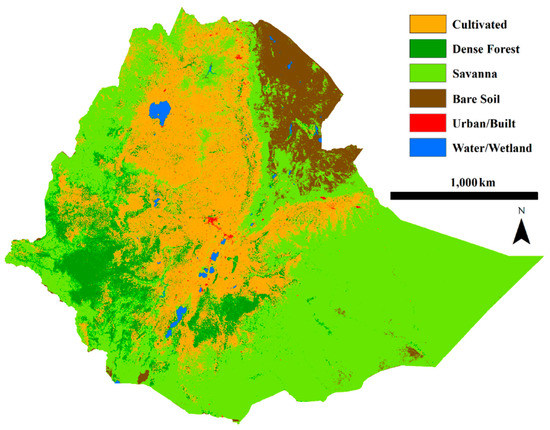 Ecological zones throughout the country are characterized into fifteen classes based on elevation and rainfall [70]. The elevation ranges from approximately 110 m below sea level to more than 4000 m above sea level. This vast irregularity in topography creates varying rainfall regimes with annual totals of 150 mm in the southeast and as much as 2000 mm in the southwest [71]. The key agricultural regions of Ethiopia experience two rainy seasons known as the Kiremt or Mehere (June–September) and the Belg (March–May) [72]. According to Biazin and Sterk [73], dry lands occupy approximately 65% of the country and only 15.1% of the land is considered arable. The dominant land covers present throughout the country include bare areas in the northeast, grassland/shrubland in the east, and rainfed croplands in the western highlands. Due to the rampant deforestation in the 1900s, forest cover is limited to just 12.5% of total land area and remains mostly concentrated in the southwest [74]. The northwestern region is barren with sparse vegetation caused by low elevation that results in high temperatures. The major cause of changes in land use/land cover in the highland regions has been deforestation, mainly due to agricultural intensification [75]. In addition to expanding agricultural land, population growth has exerted pressure through increased urban development [76,77].