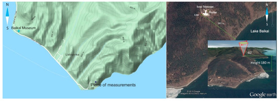 The experiments were carried out in the coastal zone at the western coast of Lake Baikal near the coastal border of the mountain range. A map of the site of measurements is shown in Figure 1. Lake Baikal is at the altitude 456 meters above sea level. Thus, as it can be seen from Figure 1 (left), the measurement site is located among coastal hills 150–350 meters high above the level of Baikal. The choice of measurement location was determined by two reasons. First, we expected that the stable stratification in this region in summer should be observed not only at night as it occurs over the land surface but also during the day because of the low temperature of water in Lake Baikal. Second, we expected that the coastal mountain range would provide the conditions for more frequent formation of LLJs and internal atmospheric waves than occurs over plane land surface.