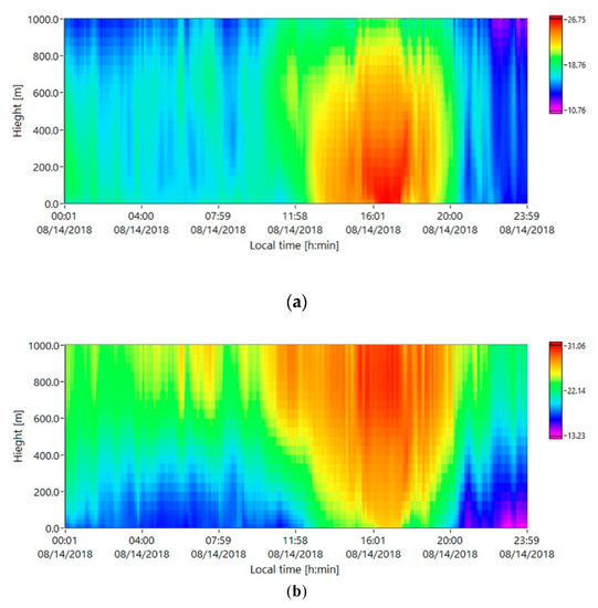 Figure 3. Diurnal variations of (a) temperature and (b) potential temperature in degrees Celsius on 14 August 2018.