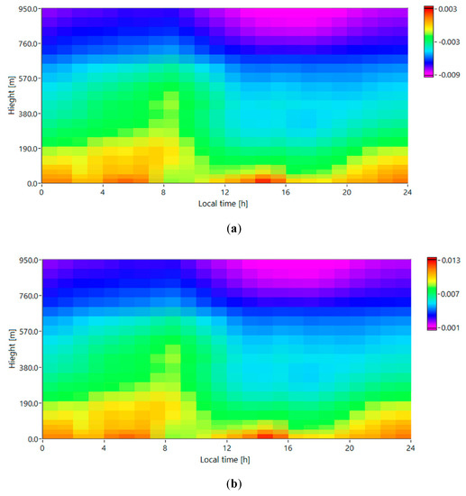 The same is true for the entire experiment. As the obtained temperature data demonstrate, in the atmosphere at the measurement site, the stable stratification occurred during 6–23 August 2018. This is seen in Figure 4, which shows the diurnal course of the average (over all of the measurement days) vertical temperature gradient. The values of the averaged vertical temperature gradient T ( h , t ) / h exceeded γ a = 0.0098 deg/m during the entire 24 h. Correspondingly, the averaged vertical gradient of the potential temperature γ p = T p / h = T ( h , t ) / h + γ a always had positive values.