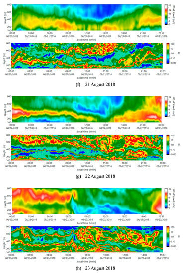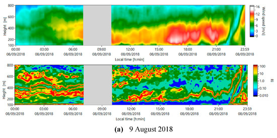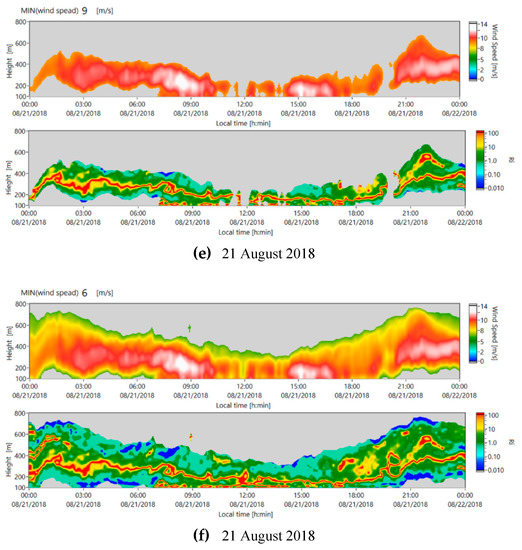 Figure 5. Spatiotemporal distributions of the wind velocity and Richardson number on (a) 9, (b) 11, (c) 12, (d) 18, (e) 19, and (fh) 21–23 August 2018.