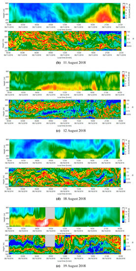 Figure 3 depicts the diurnal dynamics of the temperature measured in 3 min intervals on 14 August 2018 at heights from 180 to 1180 m above the Lake Baikal water surface. It is seen from the figure that the vertical profile of the potential temperature was inverse with respect to the measured temperature. The potential temperature increased with height. Thus, the regime of stable stratification was observed for all 24 h of 14 August 2018.