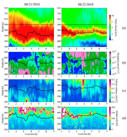 Figure 7. Height–temporal distributions of wind velocity (a), turbulent energy dissipation rate (b), variance of radial velocity (c), and integral scale of turbulence (d) assessed from the lidar data obtained during low-level jets (LLJs) on 21 (left) and 22 (right) August 2018. Black curves show the smoothed time series of the maximal wind velocity (LLJ center).