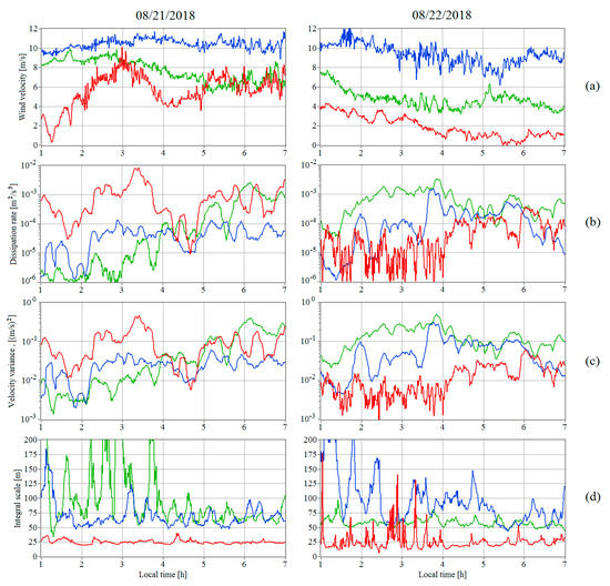 Figure 8. Time series of wind velocity (a), turbulent energy dissipation rate (b), variance of the radial velocity (c), and integral scale of turbulence (d) at heights of 117 (red curves), 351 (blue curves), and 507 m (green curves) during LLJs of 21 (left) and 22 (right) August 2018. The data are taken from Figure 7.
