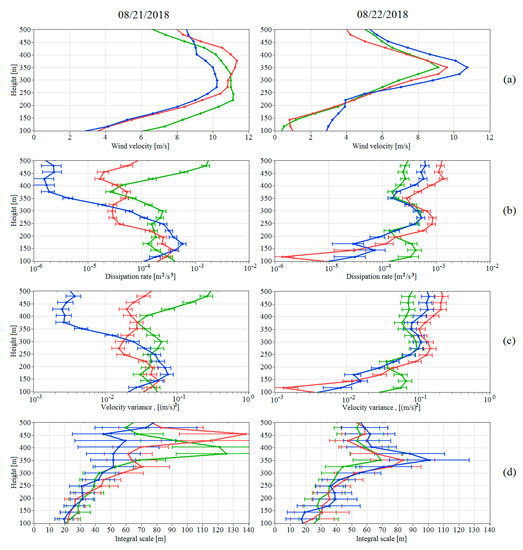 It follows from Figure 7d, Figure 8d, and Figure 9d that the integral scale of turbulence, on average, increased with height, achieving maximal values of 100–140 m at the central part of the jet streams and then decreasing down to 80 m (measurements of 21 August 2018) and to 60 m (measurements of 22 August 2018) at a height of 500 m. The obtained estimates of the integral scale of turbulence agree with the experimental data [17,27].
