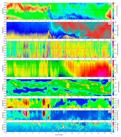 Figure 10. Height–temporal distributions of wind velocity (a), wind direction angle (b), vertical component of wind velocity (c), air temperature (d), Richardson number (e), turbulent energy dissipation rate (f), variance of radial velocity (g), and integral scale of turbulence (h), as obtained from the data of the measurements by the lidar and by the profiler on 23 August 2018.