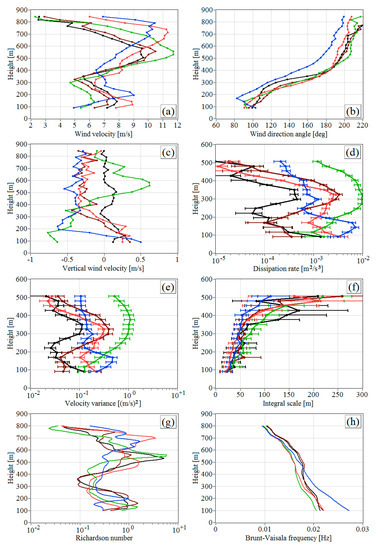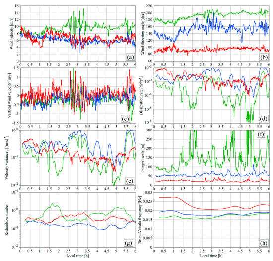 Figure 11. Time series of wind velocity (a), wind direction angle (b), vertical component of the wind vector (c), turbulent energy dissipation rate (d), variance of the radial velocity (e), integral scale of turbulence (f), Richardson number (g), and Brunt–Väisälä frequency (h) at heights of 91 (red curves), 325 (blue curves), and 506 m (green curves). The data for (ag) are taken from Figure 10.