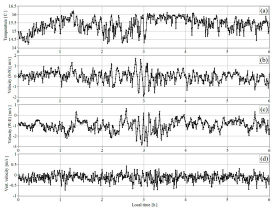 Figure 13. Time series of air temperature (a), horizontal component of the wind velocity from south to north (b), horizontal component of the wind velocity from west to east (c), and vertical wind velocity (d) obtained from the measurements by the sonic anemometer at a height of 10 m above the Baikal level on 23 August 2018 after the application of the procedure of low-frequency filtering with 30 s averaging.