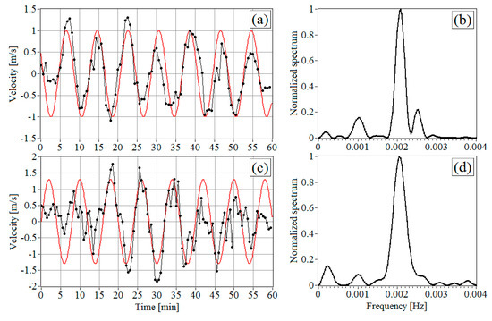 To demonstrate that T v S = T v , we determined the frequencies (periods) of the internal atmospheric wave based on the wind velocity power spectra calculated with the fast Fourier transform from the time series of the wind velocity components measured by the sonic anemometer and by the lidar. In the Fourier transformations, we used 1 h intervals of the experimental time series, starting from 02:30 LT, with the addition of the corresponding number of zeros to the data array. Then, we determined the amplitude and the phase of the atmospheric wave through the approximation of the experimental time series by the harmonic functions with found periods using the least-square technique. The obtained model harmonic time dependences of the wind components are shown as red curves in Figure 14. The time series of the oscillating wind velocity components and their power spectra obtained from the sonic anemometer and the lidar measurements are shown in this figure as well. It is seen that the power spectra had a maximum at one, and the same frequency corresponded to the period of 8 min. A possible reason for the small deviations of the experimental time series from the model harmonic functions is the influence of large-scale wind velocity inhomogeneities, comparable with the diameter of the base of the cone of the scan in the case of the lidar measurements or with the distance at which the air masses were transported by the mean wind for 30 s, as in the case of the measurement by the sonic anemometer.