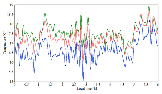 Figure 15. Time series of the air temperature at heights of 450 (green curve), 600 (red curve), and 750 m (blue curve), as obtained from the measurements by the temperature profiler on 23 August 2018.