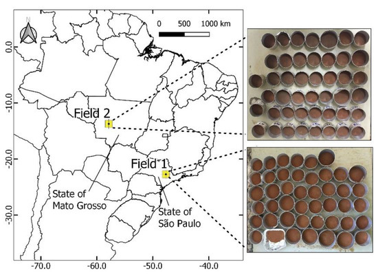 Location of Field 1 and Field 2 in Brazil, where the soil samples were collected.