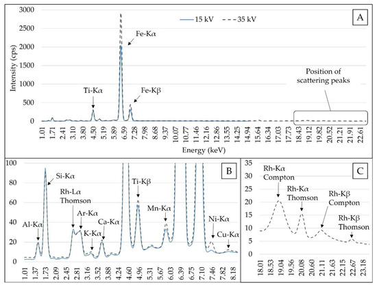 Mean of X-ray fluorescence (XRF) spectra obtained with an X-ray tube set at 15 and 35 kV (A). Snapshot of the emission lines from 1.01 to 8.34 keV, which presented lower fluorescence emission in relation to the Kα emission lines of iron (Fe) and titanium (Ti) (B). Snapshot of scattering peaks (C). Counts of photons per second was abbreviated as cps.