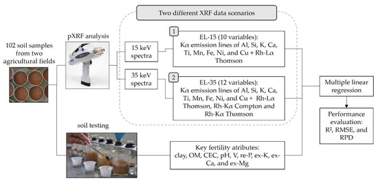Each one of the two XRF data scenarios (EL-15 and EL-35) was pulled in one matrix with the key fertility attributes (clay, OM, CEC, pH, V, re-P, ex-K, ex-Ca, and ex-Mg), measured via the above detailed commercial laboratory procedures. Calibration models were built using multiple linear regressions (MLR), as suggested by Weindorf and Chakraborty [12], using the Unscrambler® version 10.5.1 (Camo AS, Oslo, Norway). Calibration models were developed for each of the studied soil fertility attributes. The two-field dataset (n = 102) was divided into two subsets by means of the Kennard Stone algorithm [38], to 70% of data used for calibration and the remaining 30% used for validation. Descriptive statistical analyses were applied to characterize the variability of fertility attributes of both calibration and validation datasets. The methodology applied in this work was diagrammatically presented in Figure 3. The importance of XRF variables for the prediction of each fertility attribute was evaluated by the standardized regression coefficients of the regression analysis.
