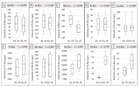 Box plot of the intensity of the lines Al-Kα, Si-Kα, Rh-Lα, K-Kα, Ca-Kα, Ti-Kα, Mn-Kα, Fe-Kα, Ni-Kα, and Cu-Kα ((A–J), respectively) obtained using a portable X-ray fluorescence (XRF) sensor configured with two different X-ray tube voltages (15 and 35 kV). The XRF scenario using the X-ray tube set at 15 kV is named EL-15 and the XRF scenario using the X-ray tube set at 35 kV is named EL-35. The Pearson correlation between the EL-15 and EL-35 is also presented (correlations followed by * were significant at the probability level of 0.01).