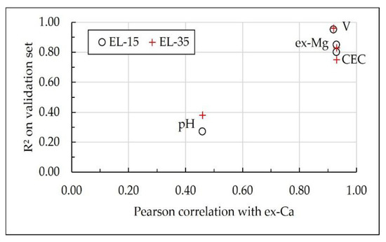 Scatter plot of the determination coefficient (R2) obtained on the validation set of models calibrated for cation exchange capacity (CEC), pH, base saturation (V), and exchangeable (ex-) Mg versus the correlation coefficient (r) of each mentioned attribute with the ex-Ca content. The relationships for the XRF data scenarios EL-15 and EL-35 are represented by circles and crosses, respectively.