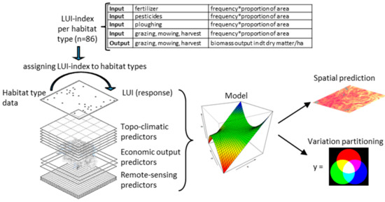 In the new approach, LUI parameters are derived from habitat types, i.e., areas with particular environmental conditions and management regimes that are sufficiently uniform to support a characteristic assemblage of organisms. Habitat type-specific ratings of agricultural inputs and biomass outputs are then assembled into an LUI index that can be spatialised. This spatialization is done by topo-climatic data that characterise the biophysical properties, economic output data that describe the economic properties, and remote-sensing data that address the actual local agricultural management, i.e., agricultural input and biomass output, which are constrained by the biophysical and economic properties.