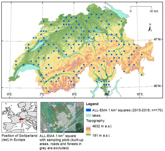 The study area was located in and along the central Alps in Switzerland (45°49′N–47°48′N, 5°57′E–10°29′E; ~41,000 km2). North of the Alps, the climate is moist and maritime. The climate is drier and more continental in the interior Alpine valleys, and the southern climate is mild and humid. The Alps act as a barrier that separates the climates of the Mediterranean and central Europe. The study area is the agricultural landscape and encompasses approximately 15,000 km2 (Figure 2).
