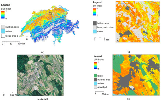 LUI map for the agricultural area based on the “full model” for the whole of Switzerland (a) and two zoom levels (b,c). (c-Aerial) is an aerial orthoimage of the same area. Settlements, forest, and areas without vegetation are masked in grey, and water bodies are masked in blue.