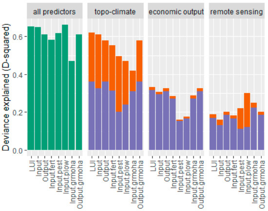 Deviance explained by the full model (green), the individual contribution (orange) and the joint contribution (violet) of the topo-climatic predictors, the economic output predictors, and the remote-sensing predictors, where LUI = LUI index; Input = the input dimension of the LUI; Output = the output dimension of the LUI; Input fert = fertiliser input; Input.pest = pesticide input; Input.plow = ploughing; Input.grmoha = grazing, mowing, and harvesting; and Output.grmoha = biomass output by grazing, mowing, and harvesting.