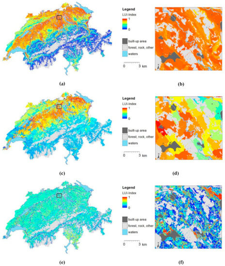 LUI map based only on (a,b) climate, topography, soil, (c,d) economy, and (e,f) remote-sensing data for Switzerland (a,c,e) and the excerpt from zoom level b from Figure 3 (b,d,f).