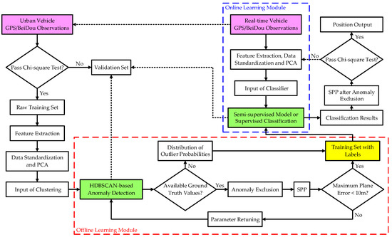 Most individual anomaly detection algorithms, including clustering, are based on post-processing (autonomously learning rules from a large amount of unlabeled sample data), so it is difficult to apply them directly in real time. However, GNSS positioning is more applied in real-time scenarios, especially for vehicle dynamic positioning in the urban environment. To cope with this problem, we designed a real-time detection framework for anomalous GNSS observations, which consists of two major parts, namely an offline learning system and an online learning system. The former provides the latter with prior knowledge of learning. The specific algorithm flow is shown in Figure 1.