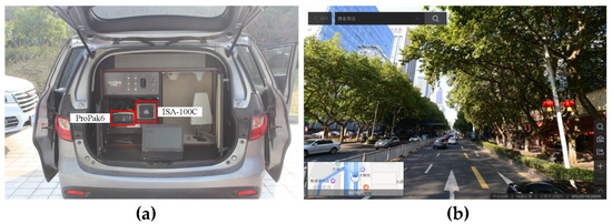 The experimental platform and test environment. (a) shows the data acquisition and calibration equipment, (b) shows a typical lane scenario in downtown Nanjing (from Baidu Map’s panorama).