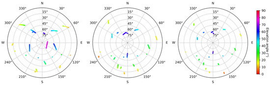 Skyplots of GNSS observations. The diagrams from left to right correspond to D1, D2, and D3, respectively.