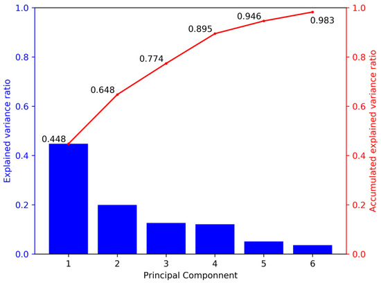To keep the features of different value ranges at the same numerical magnitude and reduce the influence of the features with large variance on the model, the feature values were standardized so that the mean value is 0 and the variance is 1. On this basis, principal component analysis (PCA) [43] is used to extract key features and improve learning speed. What is more, PCA ensures that these variables are independent of each other to avoid the instability of the solution space. The explained variance ratio represents the contribution proportion of each principal component axis to the variance of the entire dataset. In D1a, for example, the first six principal components cover more than 98% of the training set information, as shown in Figure 5. Therefore, we used these six principal components instead of the original feature values for learning. It should be noted that when testing the algorithm performance with the test sets, the feature values of the test sets must be standardized using the mean and variance parameters calculated by the training test. Similarly, we should use the dimension reduction matrix obtained from the training set to reduce the dimension of the test sets.
