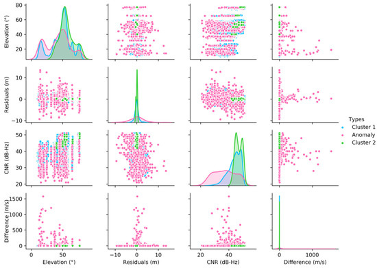 Figure 7 depicts a pair plot that indicates pairwise relationships between variables in the training set D1a. The subplots on the diagonal axes show the univariate distributions of the corresponding variables. The four variables chosen for illustration are satellite elevation angle, pseudorange residual, C/N0 measurement, and pseudorange rate consistency. According to the probability distributions of the last three variables, it can be determined that the recognition results of anomalous GNSS observations above are generally consistent with prior statistical knowledge. Specifically, the anomalous observations are characterized in probability by the largest absolute pseudorange residual, the lowest C/N0 measurement and the largest magnitude of pseudorange rate difference, which is highly similar to the properties of NLOS signals in the urban environments. Meanwhile, the satellite elevation angle has a weak ability to discern the types of GNSS observations. However, it can still be seen that points with medium-low elevation angles (less than 50°) account for the majority of the anomalies. As for Cluster 1 and Cluster 2, the samples of Cluster 2 are mainly concentrated in the region with higher elevation angle, smaller residual and larger C/N0 measurement. These samples can be defined as high-quality observations, which are most likely derived from completely contamination-free LOS signals under ideal observation conditions. Cluster 1 is a collection of those between high-quality observations and anomalous observations. Due to the interference of low multipath effect or other potential factors, its quality as a whole is not as good as that of Cluster 2, but it can still be used for position solution. In D1, the number of anomalies and non-anomalies is 677 and 18,892, respectively.