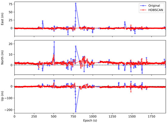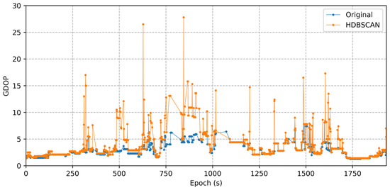 Figure 8 and Table 3 show the improvement in positioning results after HDBSCAN was used to eliminate anomalous observations. The original positioning RMSE without anomaly detection is 3.05, 2.41, and 9.88 m in the east, north, and up directions, respectively. In contrast, the positioning RMSE in the three directions after excluding anomalous observations is 1.09, 2.10, and 6.17 m, with accuracy improvements of 64.3%, 12.9%, and 37.6%. As the vehicle track generally goes from south to north, the positioning error in the east direction is relatively large compared with the north direction [44]. The experimental results show that the removal of anomalies has a better effect on the improvement of positioning accuracy in the east direction, which indicates that HDBSCAN is not only effective to identify GNSS anomalous observations but also consistent with the real situation. The continuity of dynamic positioning results is also of crucial importance while ensuring the positioning accuracy. When there are too few GNSS constellations involved in position solution, it is not advisable to lose a large number of original valid epochs by blindly pursuing the positioning accuracy. In the dataset D1a, the number of valid epochs is 1705, and after excluding anomalous observations the number becomes 1655, making the observed data available up to 97.1%. From Figure 9, besides, as the number of satellites participating in position calculation is reduced due to the exclusion of anomalous observations, the geometric dilution of precision (GDOP) has unsurprisingly risen overall. Even so, the positioning accuracy has been improved. Therefore, this method can effectively identify anomalies in GNSS observations. Moreover, the epochs after using HDBSCAN to remove anomalous observations all meet the Chi-square test.