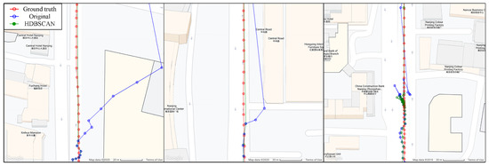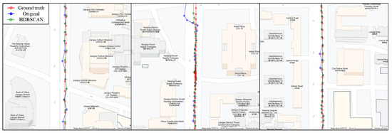 Finally, the overall effect of different anomaly detection and exclusion methods on D1 is listed in Table 8. The best localization performance is achieved by using HDBSCAN-based anomaly detection and exclusion method. Compared with the original positioning results, HDBSCAN improves the accuracy by 87.0%, 45.9%, and 69.6% in the east, north, and up directions, respectively. This is in line with the driving path of D1, and it is clear that more anomalous observations are coming from the cross-street (east) direction. Therefore, after anomaly exclusion, the positioning accuracy in the east direction improves the most. Besides, the availability remains at a high level of 92.9% (of course, it depends on the severity of the observation environment), and all the 1657 epochs meet further Chi-square tests. In complex urban vehicular environments, RAIM and cut-off values cannot effectively improve the positioning accuracy but may cause the accuracy to deteriorate.