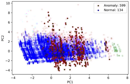 Classification results of D1b using HDBSCAN prediction. The background is the anomaly detection results of D1a.