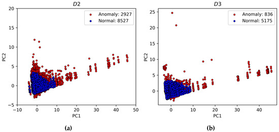 Anomaly detection results of D2 and D3 using radial basis function support vector machine (RBF SVM). (a) Anomaly results of the test set D2; (b) anomaly results of the test set D3.