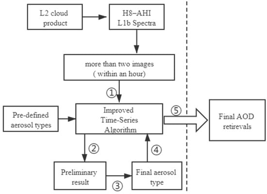 Figure 2 shows the flow chart of the ITS aerosol retrieval algorithm. For each series of cloud-free pixels from more than two H8–AHI scans within an hour, the preliminary result consists of an aerosol type, AODs, and surface albedos (for each scan), which are retrieved in steps 1 and 2. For the pixel series in each 1° × 1° grid, the most frequent aerosol type for about 400 pixels would be set as the final aerosol type for that grid (step 3). That aerosol type is used for the final processing of the 1° × 1° image (step 4) and provides the final result (step 5). This procedure imposes a spatial constraint on the aerosol types, which to some extent ensures the accuracy of the final result.