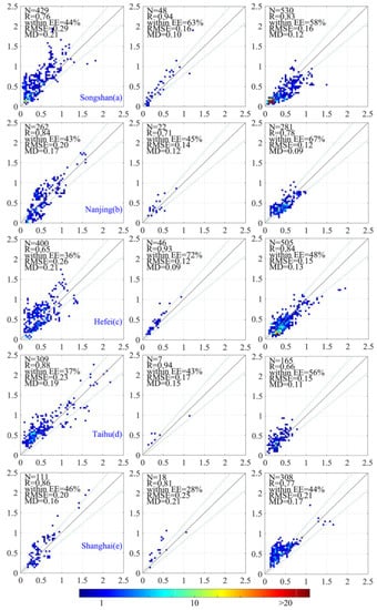For the evaluation of the H8–AHI ITS algorithm, scatterplots were made of the retrieved AOD versus reference AOD data. Four parameters were used as metrics to evaluate the performance of the ITS method: (i) the correlation coefficient (R); (ii) the percentage of ITS retrievals falling within the expected error (EE) (), which applies to MODIS data over land and has been adopted by others [9,10]; (iii) mean difference ( describes the mean bias between two datasets; (iv) root mean square error () refers to the satellite product’s absolute deviation from ground-based AOD).