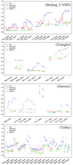 For Beijing and Beijing-CAMS, the ITS method partially overestimates the AOD (which is not encountered in other sites with an urban underlying surface, such as Jiaozuo and Shanghai), indicating that the surface correction in the ITS method may need further consideration. At the Xuzhou site, the distributions of three datasets are similar and the correlation coefficient of H8–AHI official product is larger than that for the ITS and MODIS. However, the collocations from ITS have the smallest RMSE and more collocations fall in the EE lines. Except for the two sites in Beijing, the ITS-derived data from other sites have a similar distribution (the upper or lower deviations of the EE envelope) from the MODIS product. When the underlying surface is a different type, there is no significant difference in the results, which indicates that the ITS algorithm can successfully retrieve AOD irrespective of surface type and the aerosol model is representative of the actual situation. H8–AHI provides much more data than MODIS due to the high temporal frequency, which fully reflects the advantages of the ITS algorithm applied to geostationary satellites. At the Taihu site, due to the weather, the number of successful retrievals from the ITS algorithm is less than that from the official product because two validated cloud-free pixels are needed in one hour. This results in the rejection of more pixels than the H8–AHI official method, which uses a single cloud-free observation.