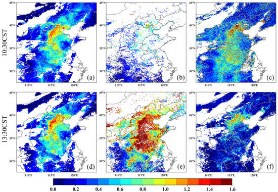 AOD maps derived from the MODIS Terra and Aqua products (panel (a,d)), the H8–AHI official product (b,e), and the ITS method (panel (c,f)) on October 05, 2018, at 10:30 China Standard Time (CST; top) and 13:30 CST (bottom).