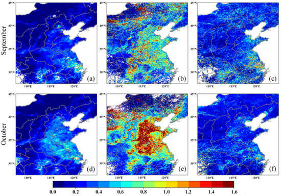 This section focuses on the spatial distribution of the ITS-retrieved AOD and its performance compared with that from the H8–AHI official product and the MODIS products. AOD maps for each of these three products, retrieved from observations on October 5, 2018, during the time of the Terra and Aqua overpasses (about 10:30 and 13.30 CST, respectively), are presented in Figure 7. Seasonal mean results including September and October 2018 are compared in Figure 8. The spatial distributions of the three datasets in Figure 7 show similar patterns but the values are very different. At 10:30 CST, the coverage of the official product (panel b) is very sparse. In contrast, in the afternoon, the H8–AHI official product (panel e) AOD is much larger than that from the ITS or MODIS. ITS-derived AOD (c and f) is much closer to the MODIS AOD (a and d), although somewhat lower. The aggregated data of the three dataset the MODIS Aqua overpass time (about 13:30 CST) can further exhibit the difference. To calculate the means, only the pixels for which the number of retrievals is larger than 2 (at least two cloud-free days) were used to calculate the monthly means. The ITS and MODIS AOD mean maps show a similar spatial pattern, while the AOD of the official product is overall much higher. This observation is consistent with the scatterplots in Figure 4. Comparison of the ITS-derived AOD maps with those from MODIS shows a qualitative similar spatial distribution, however the ITS-derived AOD is somewhat lower and patchier. This may be due to the internal accuracy difference of the two-stream model in the ITS algorithm.