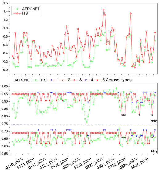 The use of accurate aerosol types is crucial. The aerosol type retrieved by the ITS algorithm has a good correlation with the real situation, and the influence of the absorption as expressed by the ssa and the asy on AOD was found (Figure 10). However, this algorithm only considers these two parameters, so it should be improved in the future to cover a variety of atmospheric properties for a specific area, such as eastern China [62]. On the other hand, the degrees of freedom available from satellite observations are insufficient to provide detailed information on the aerosol properties, which may lead to a simple formulation of aerosol models, providing a priori estimates, which are refined in the retrieval processing using the observations at different wavelengths [33,34].