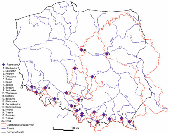 The reservoirs are formed when a river valley is artificially blocked by a dam [1]. So far in Poland, 101 reservoirs have been built with a storage capacity of over 106 m3 [2,3]. Their total capacity constitutes only about 5–6% of the total annual discharge to the Baltic Sea [4]. According to the Water Framework Directive (WFD, Directive 2000/60/EC), dam reservoirs are treated as heavily modified water bodies, and thus, until 2021 they are required to reach at least a good ecological status.