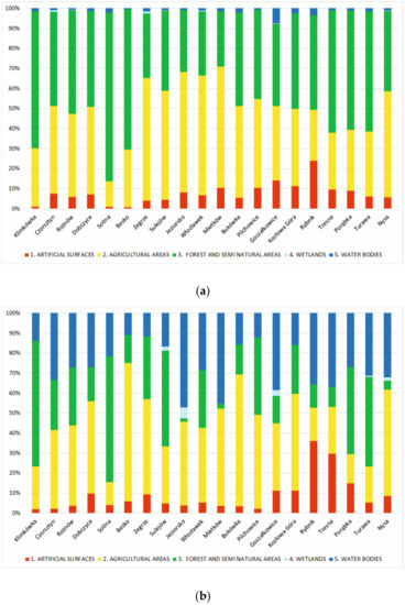 Percentages of particular land use types according to the CORINE classification in the catchments of the analysed reservoirs: (a) total catchment, (b) sub-catchment.