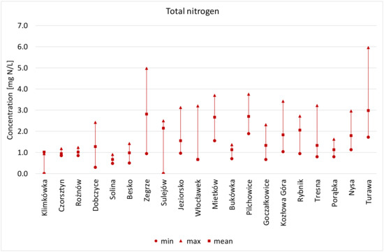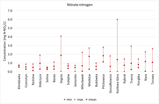 In most of the analysed reservoirs, average concentration of nitrate nitrogen did not exceed 1.0 mg N–NO3/L. Only in Dębe, Mietków, Pilchowice, Kozłowa Góra, Nysa, and Turawa reservoirs did the average concentrations of nitrate nitrogen exceed 1.0 mg N–NO3/L. The maximum value of nitrate nitrogen was recorded for the Porąbka reservoir, with 7.10 N–NO3/L. The greatest variability of nitrate nitrogen was also found in this reservoir (Figure 7).
