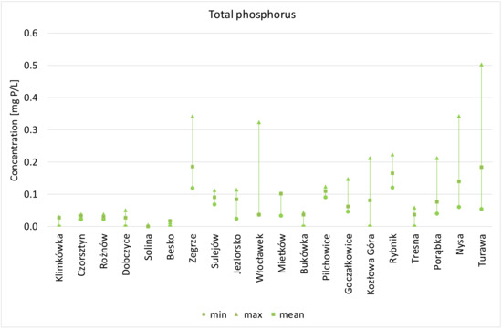 The threshold value for TP for water quality class I is ≤0.20 mg/L. The water of all analysed reservoirs does not exceed this value. Average concentrations of TP reflect distinctive differences. In Carpathian reservoirs, average concentrations are more than six times lower than in reservoirs with the highest concentrations, such as Dębe, Rybnik, and Turawa, with values above 0.180 mg P/L. The maximum value of TP of 0.51 mg P/L was recorded for the Turawa reservoir. The largest variability of TP is also observed in this reservoir (Figure 6).