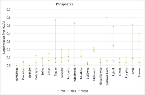 The highest average concentration of phosphates is found in the Rybnik reservoir, where this value is amounting to 0.247 mg P–PO4/L. The threshold value for water quality class II is ≤0.130 P–PO4/L. The main impact in the reservoir catchment is industry and municipal economy. The lowest average concentration of phosphates is found in the Włocławek reservoir, with 0.03 mg P–PO4/L, which is similar to the values recorded for the Solina reservoir of 0.05 mg P–PO4/L. In most of the analysed reservoirs, average phosphate concentrations do not exceed the threshold value for quality class I with ≤0.065 mg P–PO4/L. Reservoirs with average concentrations reflecting water quality class II for dam reservoirs include Dębe, Sulejów, Jeziorsko, Mietków, and Nysa. Exceeding values for water quality class II was found only in the Rybnik reservoir with 0.247 mg P–PO4/L and in the Pilchowice reservoir with 0.197 mg P–PO4/L, respectively. The Kozłowa Góra reservoir has the highest maximum value of 0.61 P–PO4/L (Figure 8).