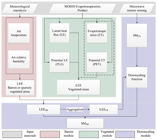 Figure 1 shows the structure and data flow of the DSCALE_mod16 model. MODIS ET products (MOD16), original microwave remotely sensed coarser-resolution SM (), and gridded meteorological data are three input data sources for the DSCALE_mod16 model. The MOD16 products were processed with the vegetated module in order to calculate LEE for vegetated areas. As the MOD16 products did not calculate ET for non-vegetated areas, the gridded meteorological data were employed to approximate LEE over barren or sparsely vegetated areas with the barren module. Subsequently, we integrate the LEE estimates from vegetated module and barren module to obtain a spatially continuous higher-resolution LEE (). Finally, higher-resolution SM () measurements are derived through coupling the and a downscaling module. Specific details of the three modules, i.e., Barren module, Vegetated module, and Downscaling module are introduced as follows.