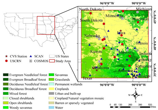 Spatial distribution of the study area, core validation station (CVS), and three sparse networks (COSMOS, SCAN, USCRN) in situ stations of measuring soil moisture at ground.