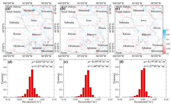In addition, we evaluated the downscaled results in terms of mass conservation property. For this evaluation purpose, we aggregated the downscaled SM to the same spatial resolution as their original SM and subtracted the aggregated SM from the original SM data. The difference between the original and aggregated SM data is the indicator of energy conservation. Figure 5a–c shows such differences on the same days as in Figure 3. We can see that the differences are very close to 0 for most of the area. Figure 5d–f are the statistical histograms of the above differences, where μ is the mean and σ is standard deviation of the differences. The mean μ of the differences is −0.04×10−2 m3/m3, −0.10×10−2 m3/m3, and −0.19×10−2 m3/m3 for these three days, which are very close to zero. The standard deviation σ of the differences is 1.47×10−2 m3/m3, 1.44×10−2 m3/m3, and 1.27×10−2 m3/m3, which are also very small. We further analyzed the differences over the entire study period from 2015 to 2018 and results are shown in Figure 6. The mean of the differences varies between -0.004 m3/m3 and 0.004 m3/m3, and the standard deviation of the differences varies between 0 and 0.020 m3/m3. The near-zero mean and tiny standard deviation of the differences indicate that the moisture mass is conserved during the downscaling process. Namely, our downscaling model neither systematically increases nor decreases the moisture mass measured by the original SMAP passive radiometer.
